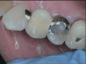 MARYLAND BRIDGE FROM INSIDE MOUTH. METAL WINGS HOLDING FALSE TOOTH. PERMANENTLY FIXED IN PLACE.